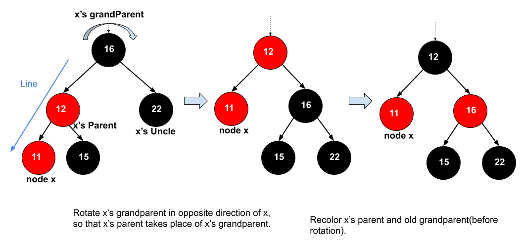 case 4: x’s uncle is black(line). => rotate x’s grandparent and recolor.